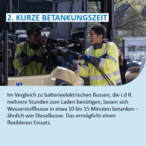 Die Betankung der Fahrzeuge erfolgt in der Anfangsphase über eine mobile Tankstellenlösung des französischen Gase-Hersteller Air Liquide. Hierbei wird der erneuerbare Wasserstoff in Trailern angeliefert und über eine sogenannte Umfülltafel direkt aus dem Trailer in den Bus gefüllt.